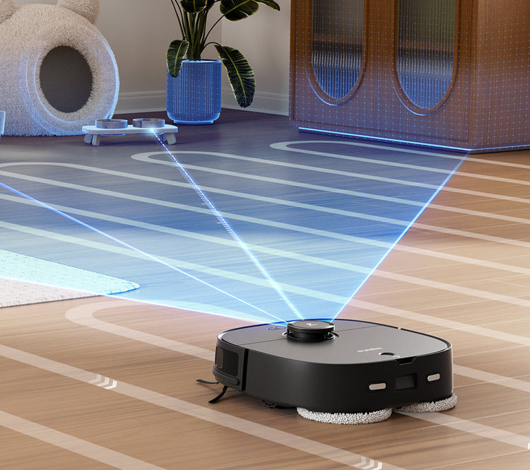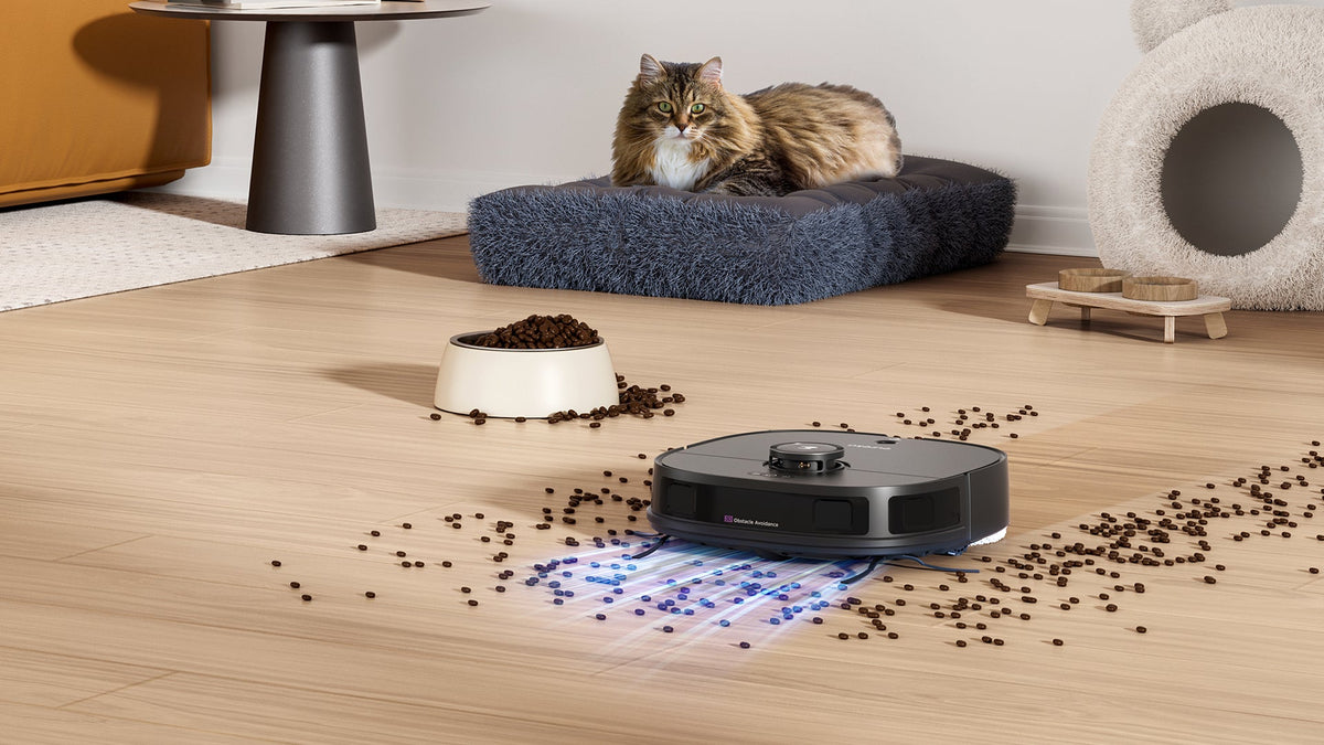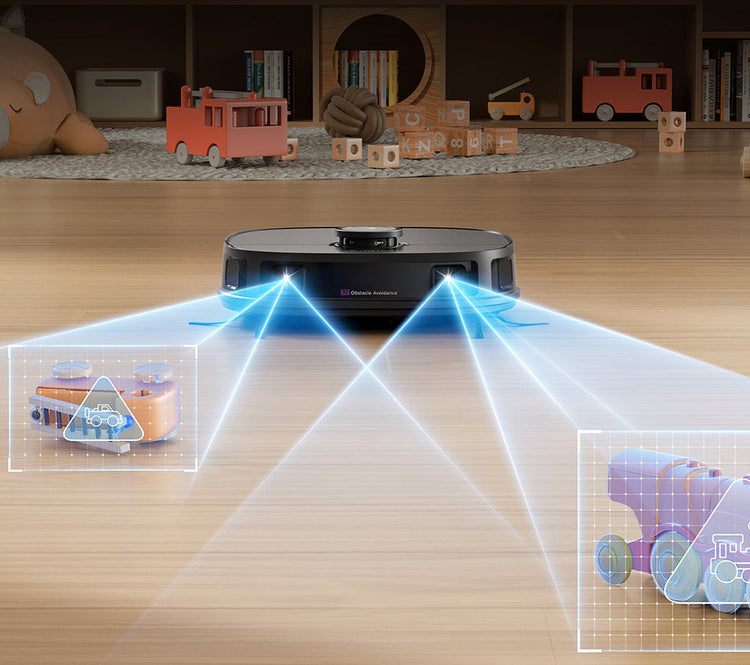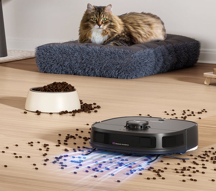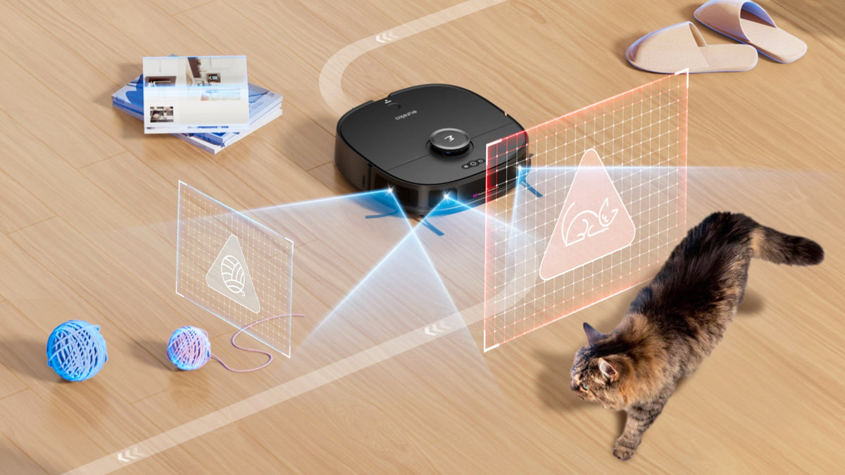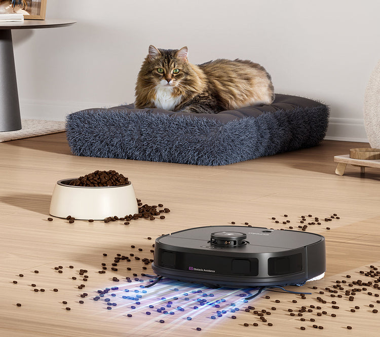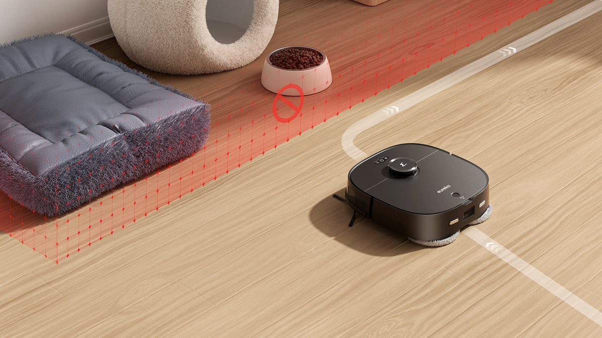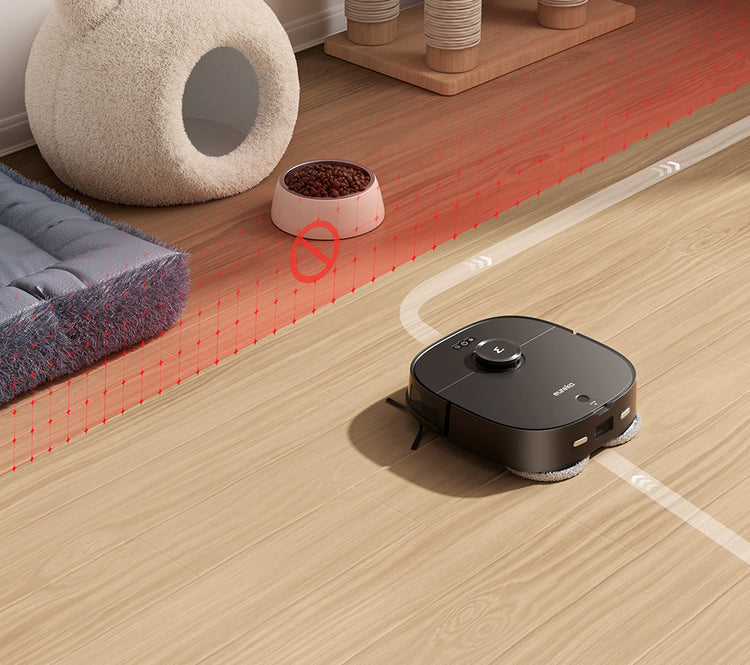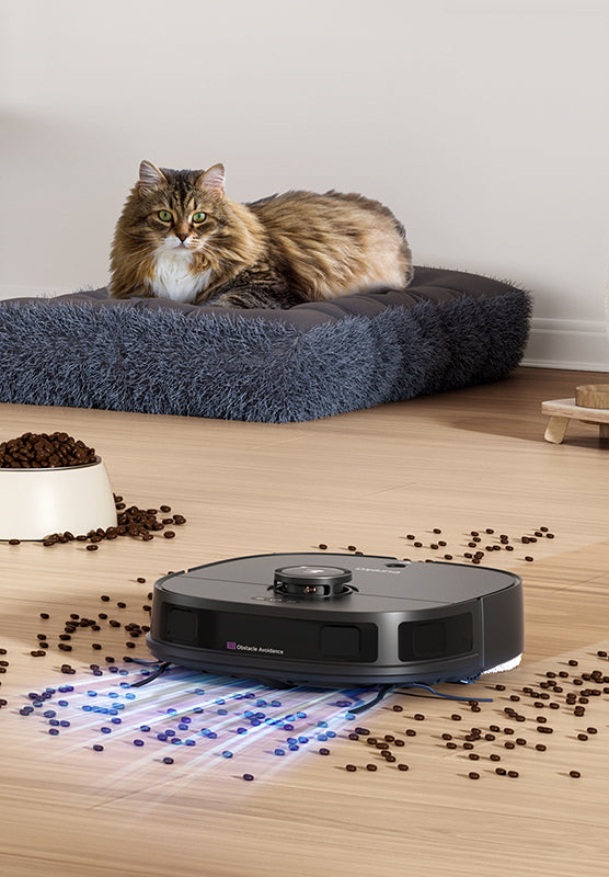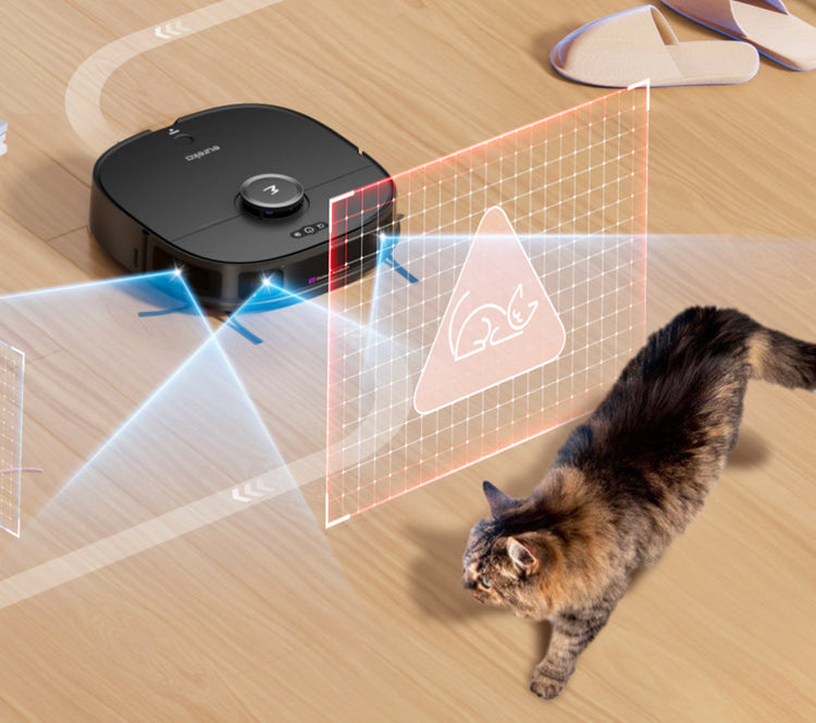Dzięki czujnikom unikania przeszkód Super Sense J12 Ultra wykrywa zwierzęta w czasie rzeczywistym, aby ich unikać i zapewnić spokój w domu.
