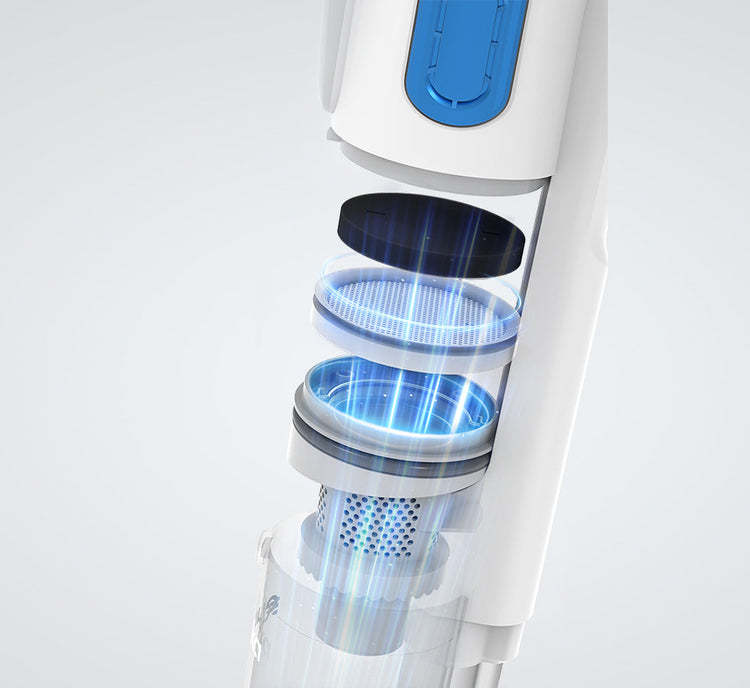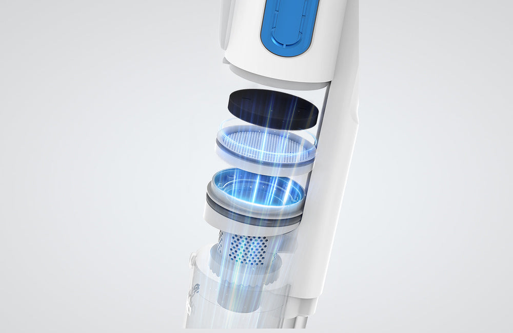 4-stopniowa filtracja cyklonowa wychwytuje cząsteczki i zapobiega ich unoszeniu się w powietrzu w domu.
