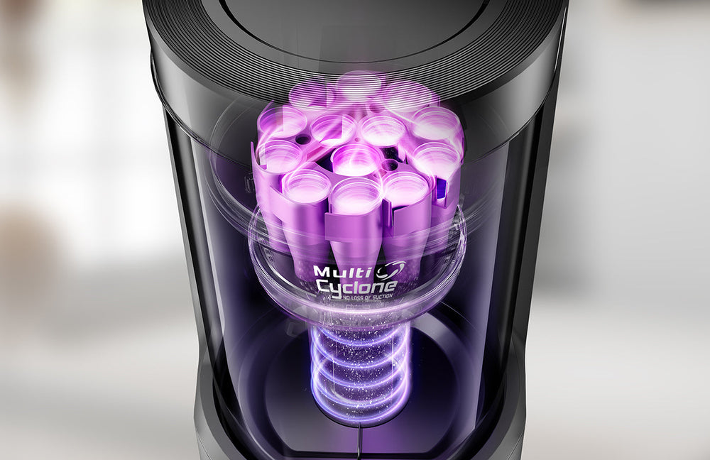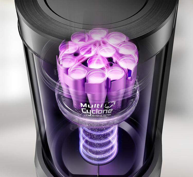 Dzięki 13 stożkom cyklonowym odkurzacz oddziela 98% kurzu i brudu, zanim dotrą one do filtra, przedłużając żywotność filtra i utrzymując siłę ssania.